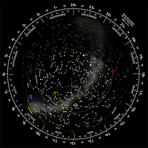 Apparences et Positions des Planètes - Lever (▲) et Coucher (▼) - Les heures sont en TU, ajoutez 1h en heure d'hiver et 2h en heure d' été. |