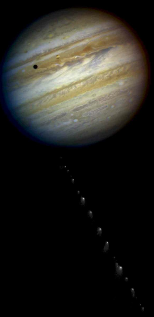 En juillet 1994, la comète Shoemaker-Levy 9 était attirée par la gravitation de Jupiter. Cette puissante force gravitationnelle cassa la comète en plusieurs morceaux qui sont entrés dans la planète.
